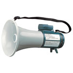 A 21cm diameter megaphone with adjustable volume and a built-in siren . The megaphone has a range of 900m max., out of town and approx. 250m in built-up areas.