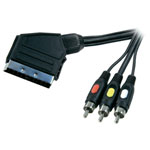 A 5m connecting cable with 3 Phono plugs on one end and a SCART plug on the other. The SCART plug has a built-in switch that selects either inputs or outputs, making the cable suitable for bi-directional use.