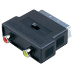 An adaptor with a Scart plug on one end and 2 Phono sockets on the other, one connected to the video and the other to the audio signal.The adaptor can be used universally, because the signal direction can be adjusted via the switch.