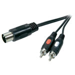 An audio lead with a 5-pin DIN plug at one end and 2 RCA Phono plugs (red/white) on the other. It can be used for example, to connect a new audio source with phono connectors to an older amplifier.