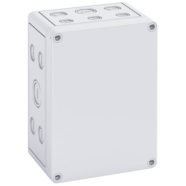 The Spelsberg TK PS 1813-9-M enclosure is made of polystyrene, and measures 130 x 180 x 90 mm. It features a light grey finish and is sold as a single piece. This enclosure is typically used in electrical installations and industrial applications for securely mounting components.