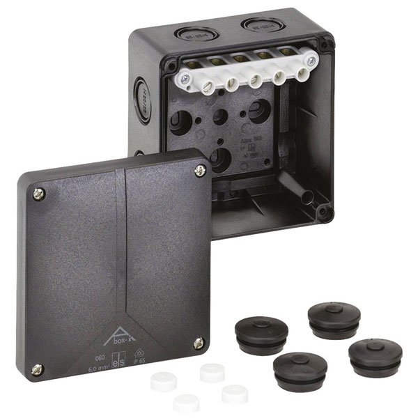 The Spelsberg 49140601 is a black junction box measuring 110 x 110 x 67 mm. It is IP65 rated, providing excellent protection against dust and water ingress. This joint box is typically used for secure electrical connections in both indoor and outdoor settings.