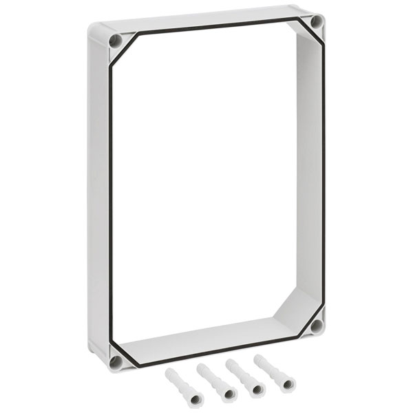 The Spelsberg 7050301 GTi GAR 3 attachment frame is a polycarbonate component measuring 320 x 440 x 75 mm. It is designed as an enclosure accessory compatible with the GTi 3 system. Typical applications include enhancing and expanding casing solutions for various electrical installations.