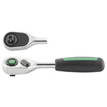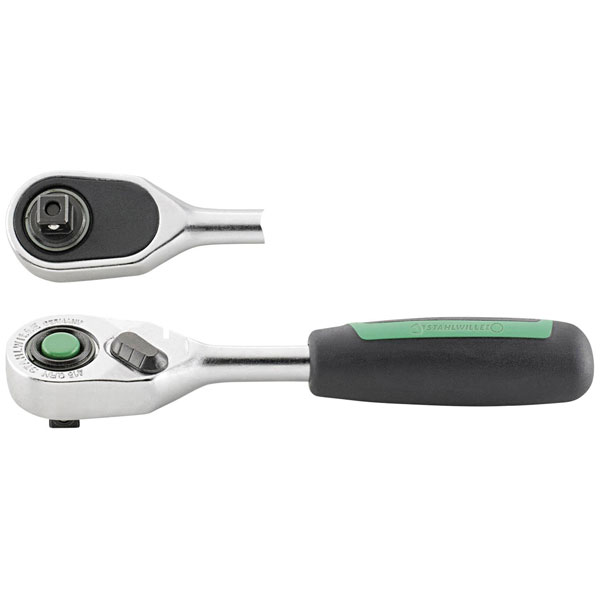 Switchable Fine tooth ratchet with 80 teeth, Quick Release safety lock and 2-component grip. Working angle of only 4.5° for jobs in confined spaces. Design according to DIN 3122 and ISO 3315.