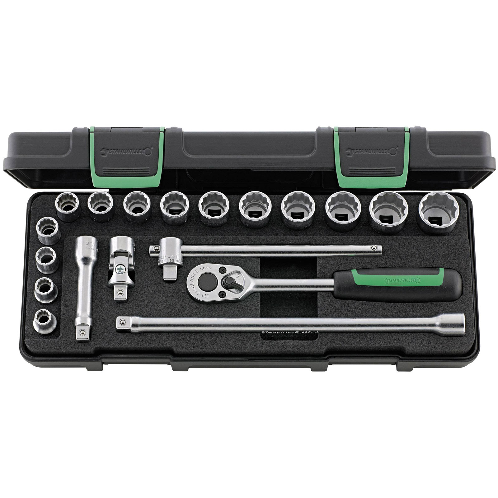 19-piece socket wrench set, Type 3/8" square, in a robust, stackable ABS-plastic box.