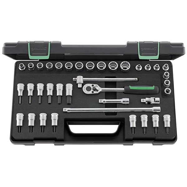 37-piece socket wrench set, Type 3/8" square, in a robust, stackable ABS-plastic box.
