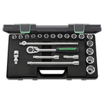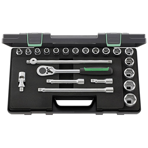 22-piece socket wrench set, Type 1/2" square, in a robust, stackable ABS-plastic box.