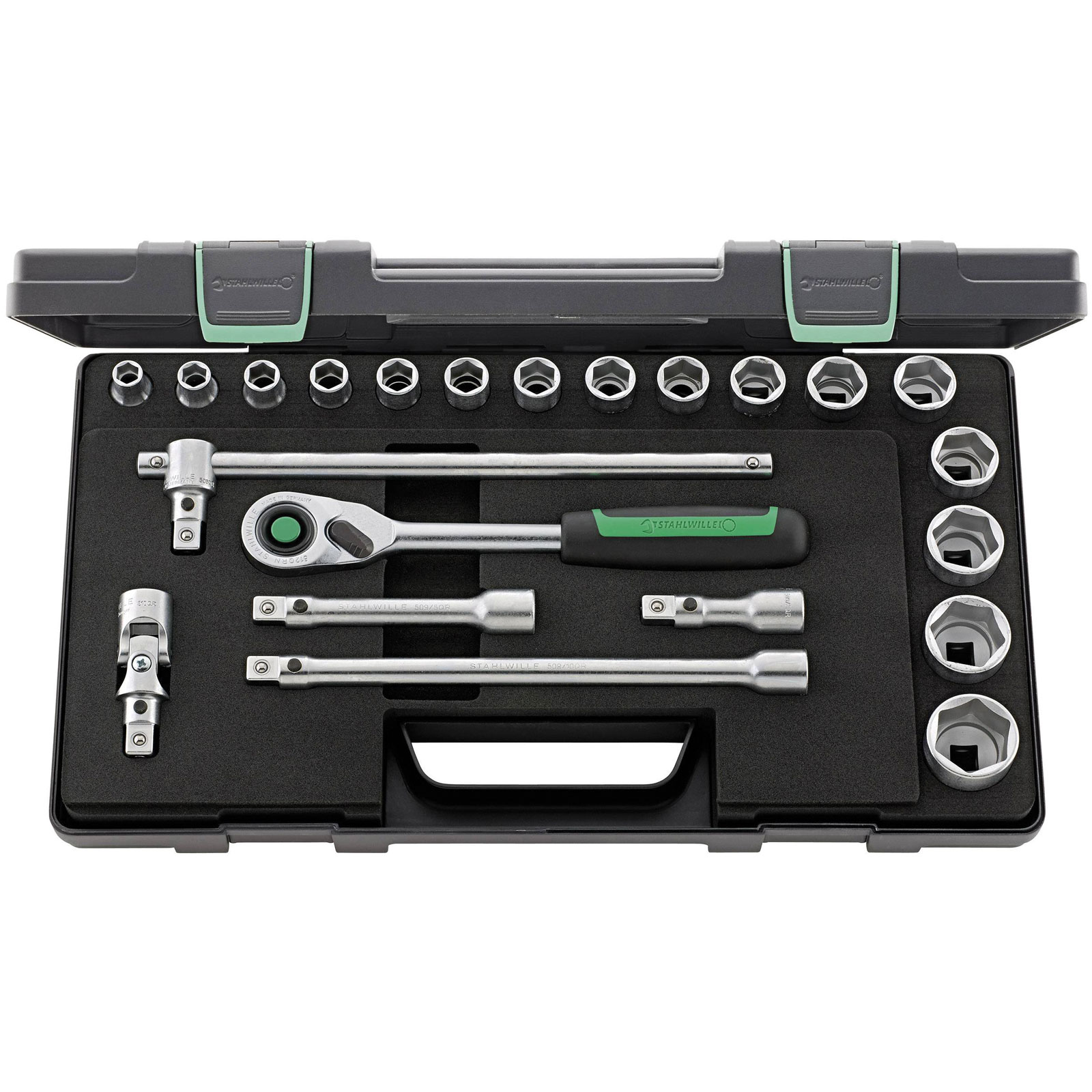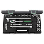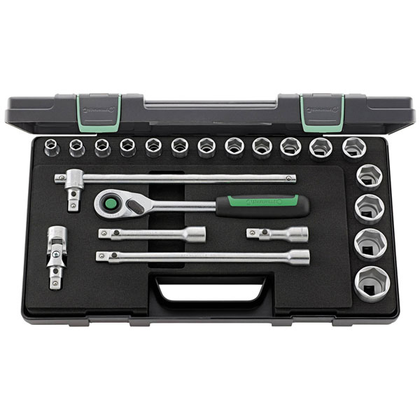 22-piece socket wrench set, Type 1/2" square, in a robust, stackable ABS-plastic box.