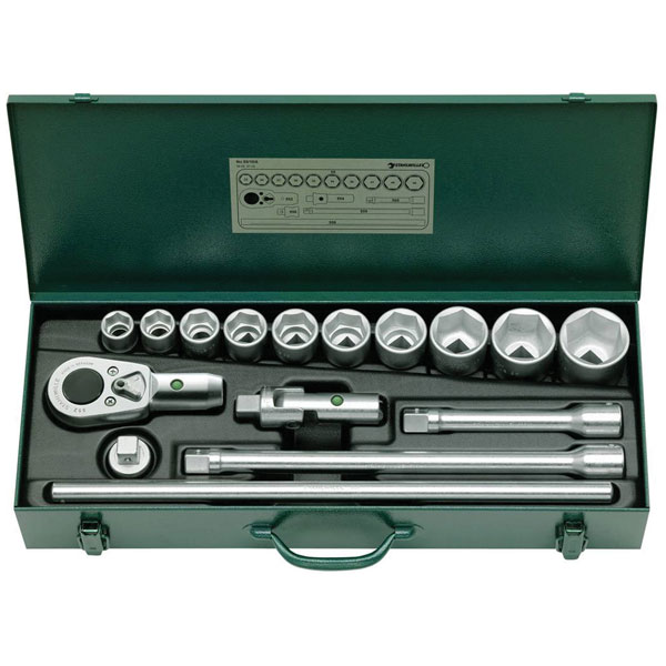 16-piece socket wrench set, Type 3/4" square, in a sturdy steel box.