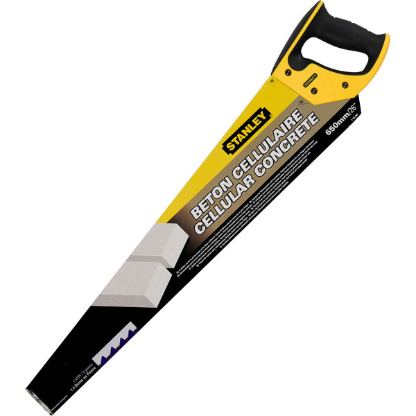 The Fatmax® concrete saw has a specially designed 660mm (26 in) blade which is ideal for cutting cellular blocks and soft stone. The teeth are induction hardened and the comfortable bi-material handle is screwed and ultrasonically welded. the handle is marked with 45° and 90° angles and the blade has 1.4 teeth per inch.