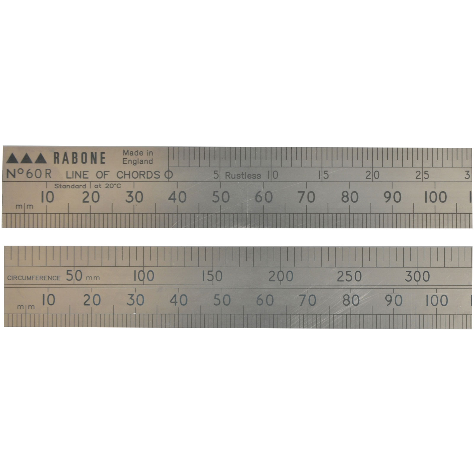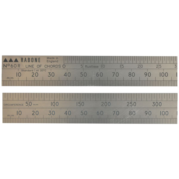 The Line of Chords Scale rule incorporates a scale from 0° to 120° in 1/2º increments. Two centre dots are provided, one on each blade and, with the aid of dividers, the rule can be set at any angle, or an existing angle can be determined line of chords. The circumference scale indicates the circumference by measuring the diameter.