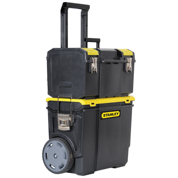 Stanley 3-in-1 Mobile Work Centre has a detachable tool box unit with small parts storage on top and a detachable mid-section for small parts and accessories. The bottom bin has large 7 inch wheels and the pull handle on top allows for easy convenient manoeuvrability.