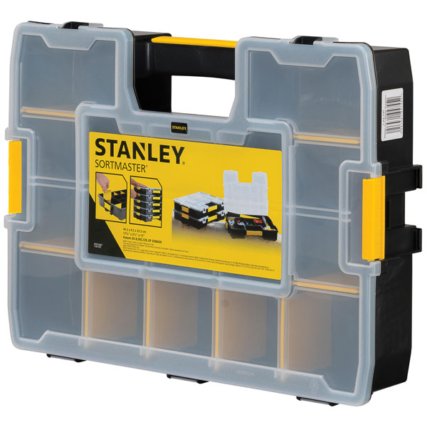 The Stanley Sortmaster organiser offers a great deal of storage flexibility. Removable dividers allow a combination of tools and small parts storage. It has a special lid structure where the upper ribs interlock with inner dividers keeping small parts in place and preventing movement from one compartment to another. A top lid lock keeps contents secure inside.