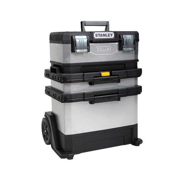 This Stanley Galvanised Metal Rolling Workshop has a 20in detachable metal plastic top tool box, that includes a portable tray for small parts and hand tools. It separates easily by pressing the front push button. It has a telescopic handle and large wheels that allow for easy manoeuvrability.