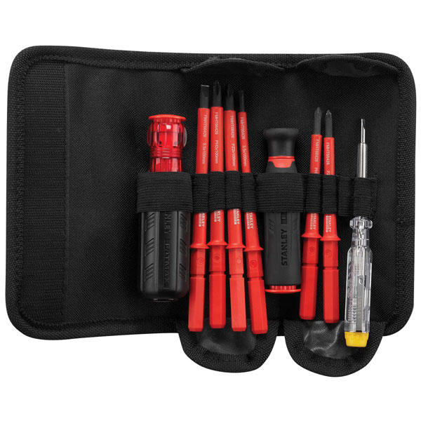 The Stanley 10 Piece VDE Multi-Bit Screwdriver Set contains two handles that cover a range of applications: a small precision handle fitted with swivelling head and a large, comfortable soft grip handle that provides excellent torque for driving screws. Shot blasted tips for improved torque and corrosion protection. Supplied in a handy storage pouch.