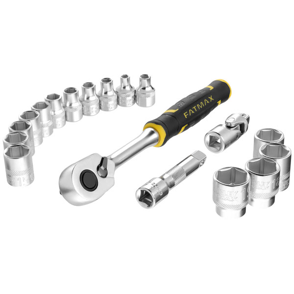 The STANLEY® FATMAX® 3/8in M PRO-STACK™ 18-Piece Socket Set contains a selection of Maxidrive Sockets; with knurling to help take and use the socket easier. A neck-down design facilitates usage in restrictive environments. The Maxidrive profile maximises contact between the socket and nut, and visible dimensions to easily identify socket size.