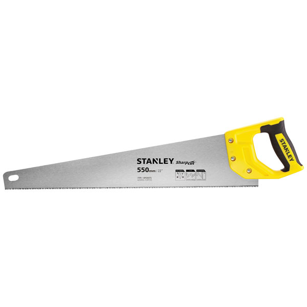 The Stanley Sharpcut™ Handsaw is a heavy-duty saw with hardened teeth ground on 3 edges for faster, easier cutting and a longer working life.