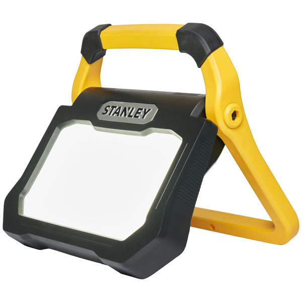 The STANLEY® Folding Worklight has a lightweight yet durable polycarbonate body. It offers 2 modes of operation, on/off. A diffuser ensures comfortable working illumination. It has an IP54 rating, indicating it is protected against dust and water splashes, making it suitable for use in various environments. Operates on mains power with a voltage range of 220-240V and a frequency of 50/60 Hz.