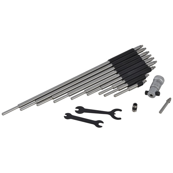Lightweight and ideal for measuring inside diameters, the rods are solid, insulated and assembled on one side of the micrometer head. Anvils on rods are adjustable for length. Rod and anvils are hardened and ground.