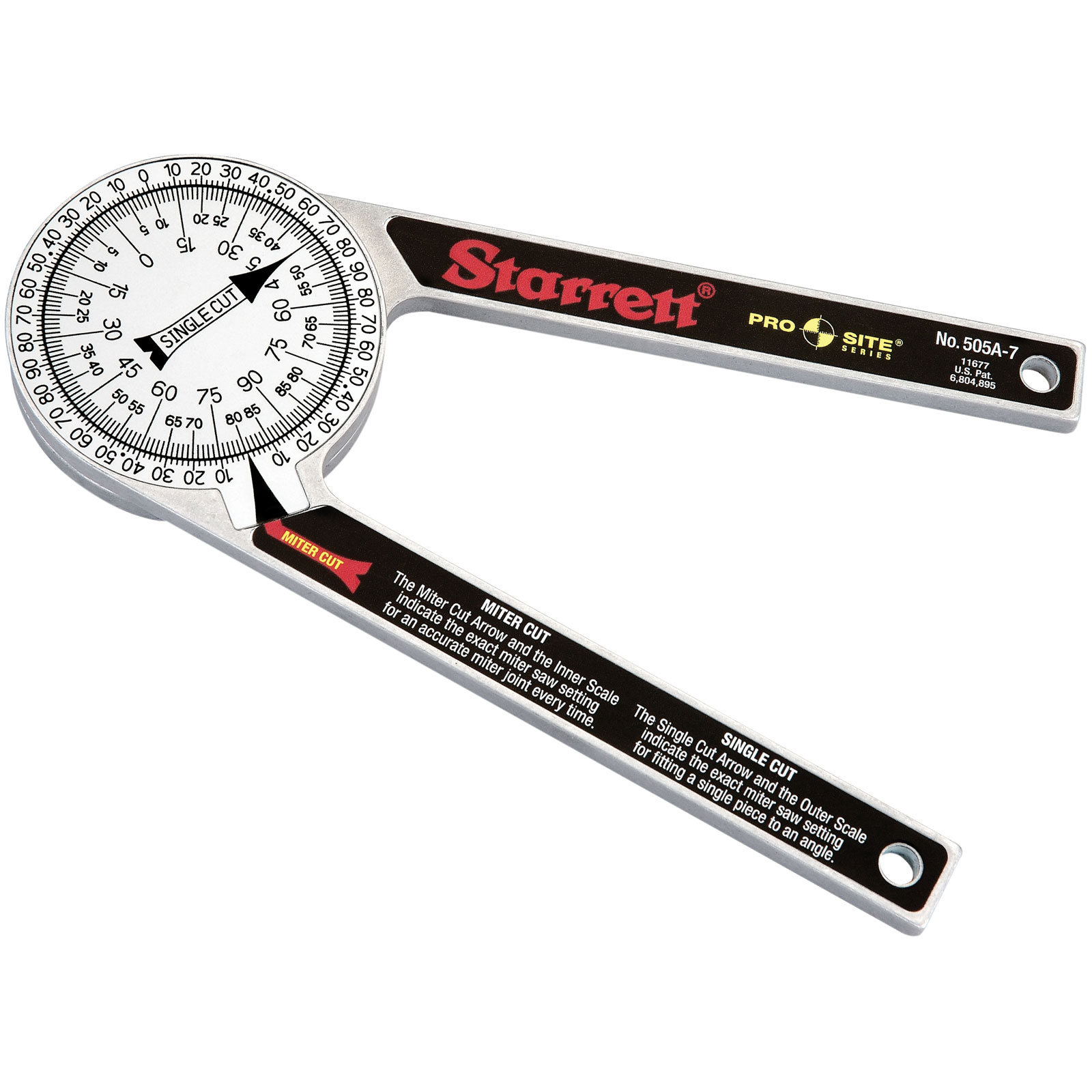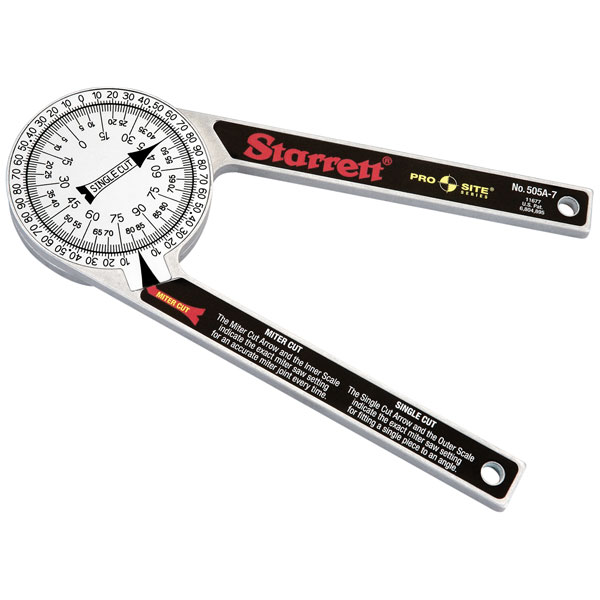 The Starrett Prosite® Protractor takes the error-prone calculations out of the process of mitre cuts. Simply set your saw to the angle that you read. Upside down or backwards, the reading is always correct. This easy-to-use tool has two scales. The 'Mitre Cut' arrow and internal scale indicate the exact mitre saw setting for an accurate mitre joint every time. The 'Single Cut' arrow and the outer scale indicate the exact mitre saw setting for fitting a single work piece to an angle.