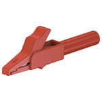 Small, slim, CAT II safety terminal clip made of brass with insulation on all sides. Serrated jaw for rough grip as well as fine wire surface. Rigid Ø 4 mm socket in the insulation body, suitable for accepting spring-loaded Ø 4 mm plugs with rigid insulation sleeve.