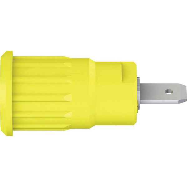 4mm rigid socket in insulated body, with 4.8mm male spade connector. Suitable for accepting spring-loaded 4mm plugs with rigid insulating sleeve. Push-fit mounting into cutout holes of plates or housings made of plastic, metal etc.