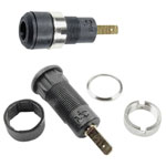 Insulated, 2mm rigid socket connector, with 2.8mm male spade connector. Suitable for accepting 2mm plug with a rigid insulating sleeve. Panel mount design, rigid connector with metal threaded collar for secure mounting into cutouts in plates or housings made of plastic, metal, etc.