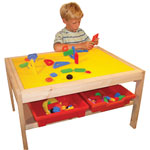 A high quality Pine table measuring 70 x 52cm and 45cm in height. The table top is recessed and takes 12 large Sticklebrick base plates. The base plates form an excellent base on which a group of children can play around the table using the surface as a starting point for their Sticklebrick models. There is a built-in shelf below the play surface which can be used for storing Sticklebricks and other toys. When not required the base plates can easily be lifted out (and stored on the shelf) allowing the table to be used as an ordinary play table.