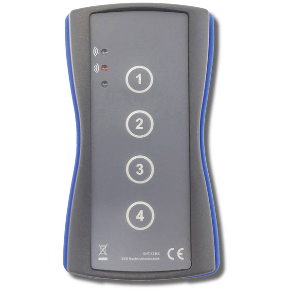 The SVS Telecommunications remote control SHT-12 BS offers a maximum range of 1000 metres in open fields and operates at 4.5 V. This device is a 4-channel remote designed to provide reliable long-distance control. It's typically used in applications requiring secure and efficient wireless communication.