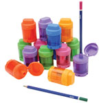 Unique patented canister-type pencil sharpeners which keep the blade well away from fingers and collects the shavings to prevent mess.