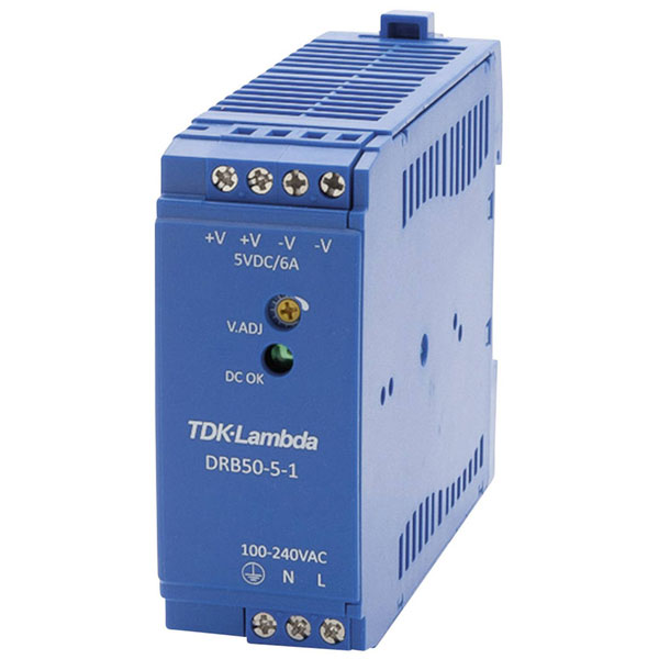 TDK-Lambda DRB50-5-1 AC/DC DIN Rail Power Supply 5V - The DRB series supports the growing trend for simple and economically priced DIN power supplies for industrial and process control applications. The series combines low cost, reliability and compact dimensions with energy saving efficiencies of up to 91%. Conservatively rated electrolytic capacitor temperatures offer improved field life-times of up to 10 years. Available in four power levels, 15W, 30W, 50W, 100W, the series provides a choice of 5, 12, 15, 24 and 48V outputs. UL1310 Class 2 models and Class 1 Div 2 (ISA 12.12.01) certifications are available.