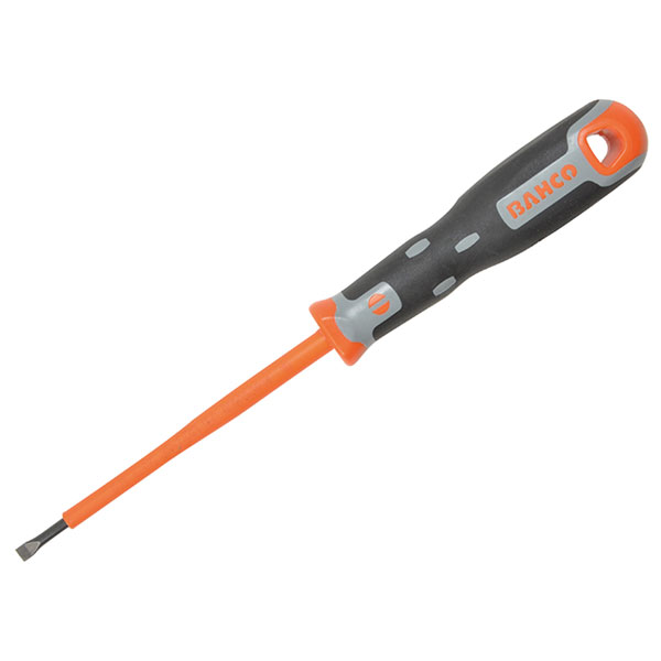 The Bahco Series 033 Slotted Tip Insulated Screwdriver for voltage work up to 1,000 Volts. The three component handle is made from Thermoplastic Rubber and Rudolit (2) and is double shaped for use with both hands (in large sizes and in proportion to the dimensions of the shank). Its large surface allows optimum comfortable grip and maximum torque.