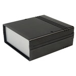 Instrument enclosure consisting of two high impact black ABS half covers measuring 134 x 129 x 54mm with anodised aluminium front and rear panels, suitable for all electronic workbench equipment including feeders, generators and counters.