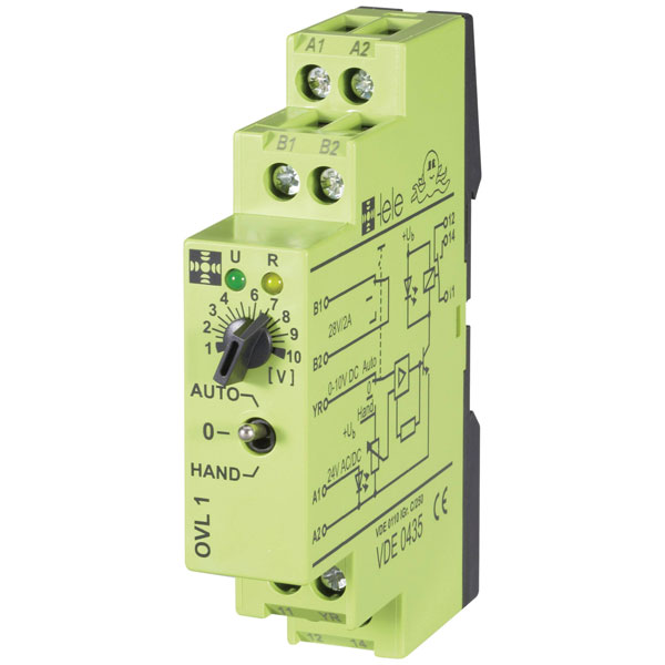 The tele OVL1 24 V/AC/DC 0 - 10 V is a threshold relay that operates with both 24 V AC and DC, featuring a 5 A change-over capability. This versatile interface relay, measuring 17.5x87x65 mm, is typically used in electromechanical applications requiring precision voltage monitoring and control. Ideal for integration in industrial automation systems, it ensures efficient operation within specified voltage thresholds.