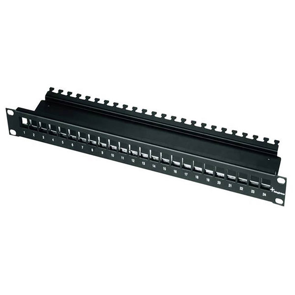 The Telegärtner 100021497 is a 24-port network patch panel designed for CAT 6A cabling, suitable for professional networking environments. This 19-inch, 1 U black module carrier is unequipped, allowing for custom configurations to meet specific network demands. It is commonly used in server rooms and data centres to organise and manage high-speed network connections efficiently.