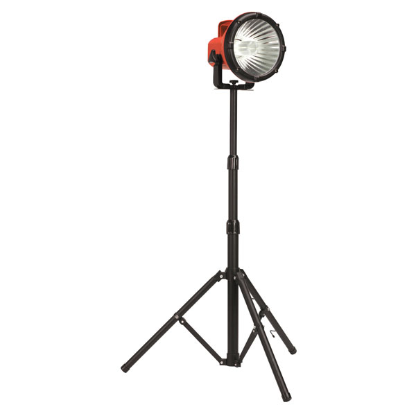 • Mounted on a two-position telescopic tripod with folding legs and cable storage hooks.