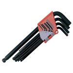 Teng Tools 9 Piece Hexagon Key Set with ball point head on the long end which permits turning at 30º angle. Made from chrome vanadium steel with a black finish. Supplied in a folding plastic holder.
