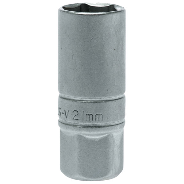 1/2in Square Drive 6-Point Spark Plug Socket made from chrome vanadium steel with a satin finish and with a rubber insert.