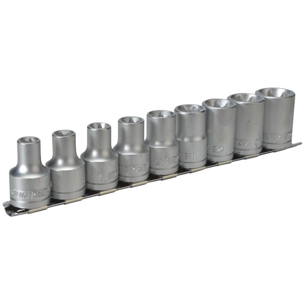 This Teng Tools 9 piece set consists of 1/2inch drive TORX sockets. The sockets are manufactured from chrome vanadium steel for strength and durability and have an attractive satin finish. They are supplied on a clip rail, which is ideal for both wall mounting and for use in a toolbox.