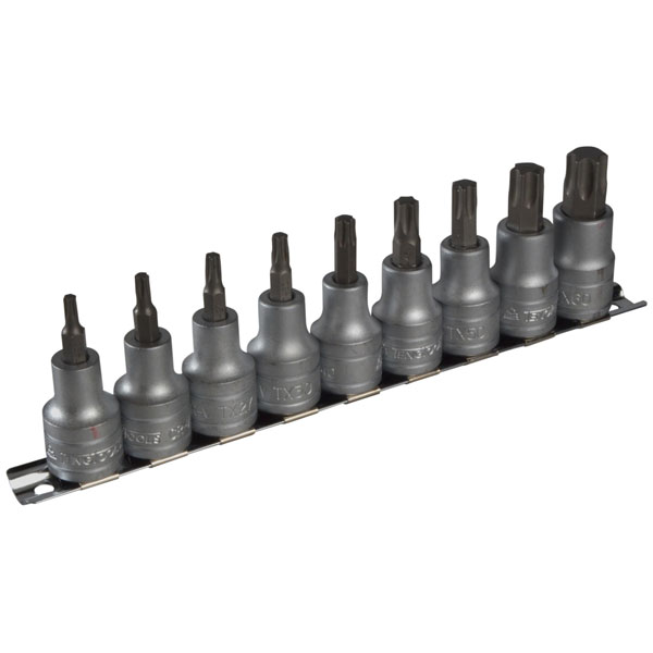 This Teng Tools 9 piece set consists of 1/2inch drive bit sockets for internal TORX heads. The bit sockets are manufactured from chrome vanadium steel for strength and durability and have a satin chrome finish. They are supplied on a clip rail, which is ideal for both wall mounting and for use in a toolbox.