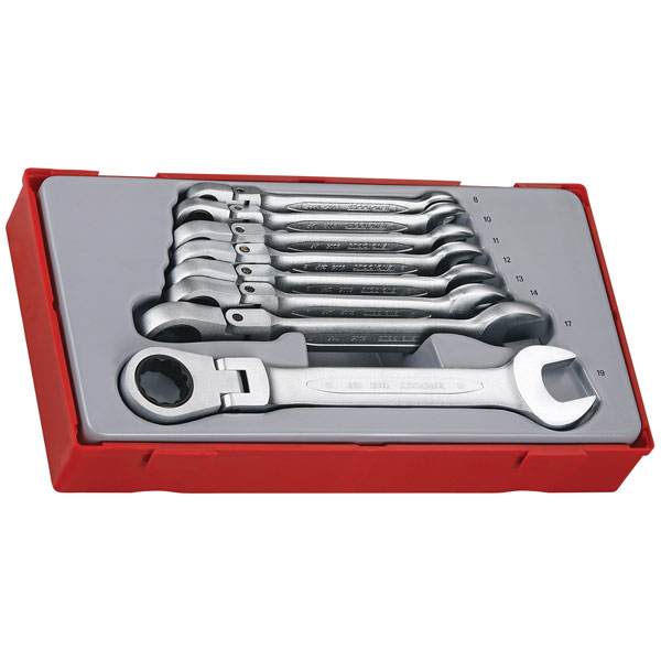 The Teng TT6508RF Flexible Ratchet Spanner Set is supplied in a unique Teng Tools TC tray, which can be used either on its own, or as part of the Teng Tools TC control system. The tray features a removable hinged click lock lid and dove tail joints, which enable different TC trays to be locked together and used as trays in Teng Tools toolboxes and roller cabinets. All of the tools in the set have their own individual place, so tools can easily be identified.