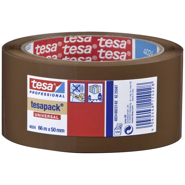The tesa UNIVERSAL 04024-00237-04 packaging tape is a durable, brown adhesive tape measuring 66 metres by 50 millimetres. Its main attributes include quiet unrolling and strong adhesion, ideal for securing cartons and packages. This PVC packing tape is commonly used for shipping and sealing cardboard boxes.