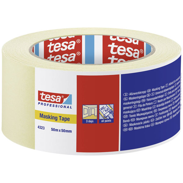 The tesa STANDARD 04323-00044-00 masking tape is a beige paper adhesive tape measuring 50 metres in length and 50 millimetres in width. It is ideal for use in painting and masking applications, ensuring clean edges and easy removal. This versatile tape is commonly used by painters for protecting surfaces when painting.