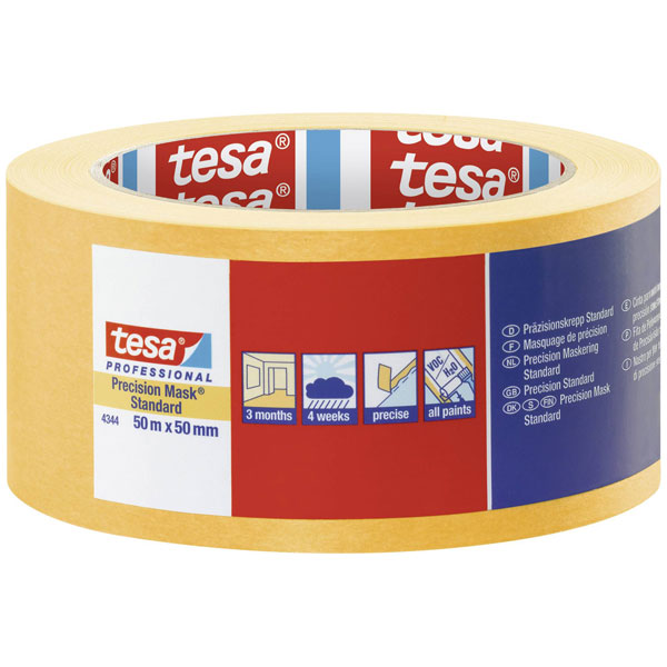 The tesa PRECISION STANDARD 04344-00000-00 is a yellow masking tape measuring 50 metres in length and 50 millimetres in width. This high-precision paper adhesive tape is ideal for painting tasks, ensuring sharp paint edges without residue. It is typically used for masking surfaces during painting projects to achieve professional results.