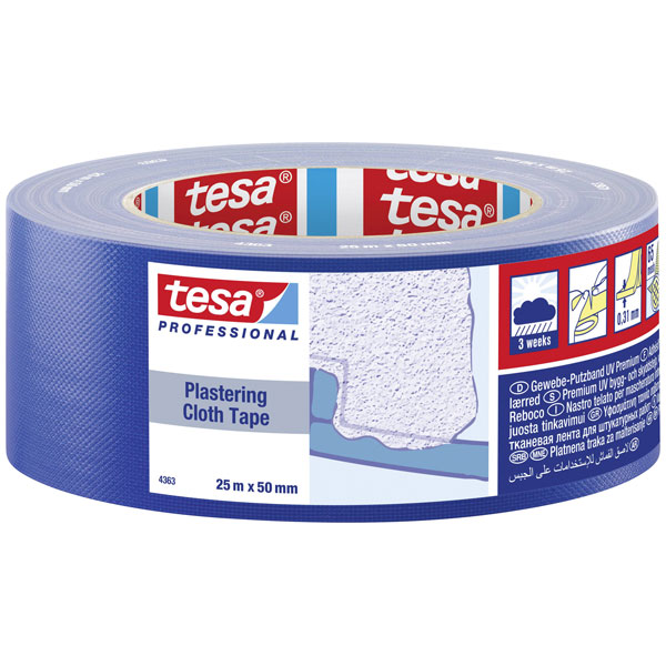 The tesa plastering tape 04363-00001-02 is a blue fabric adhesive tape measuring 25m by 50mm. It is ideal for facade protection, masking windows, and painting applications. Manufactured by tesa, this tape is specifically designed for cleaning and protecting outdoor plaster surfaces.