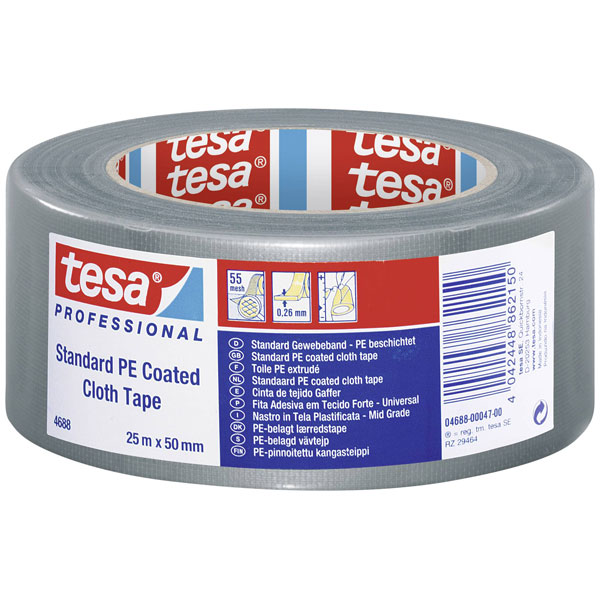 The tesa repair tape is a professional-grade, silver fabric adhesive tape measuring 25m in length and 50mm in width. This durable tape is ideal for sealing, repairing, and marking tasks in both indoor and outdoor environments. Its robust construction makes it suitable for various applications including sealing window panes and gluing foils.