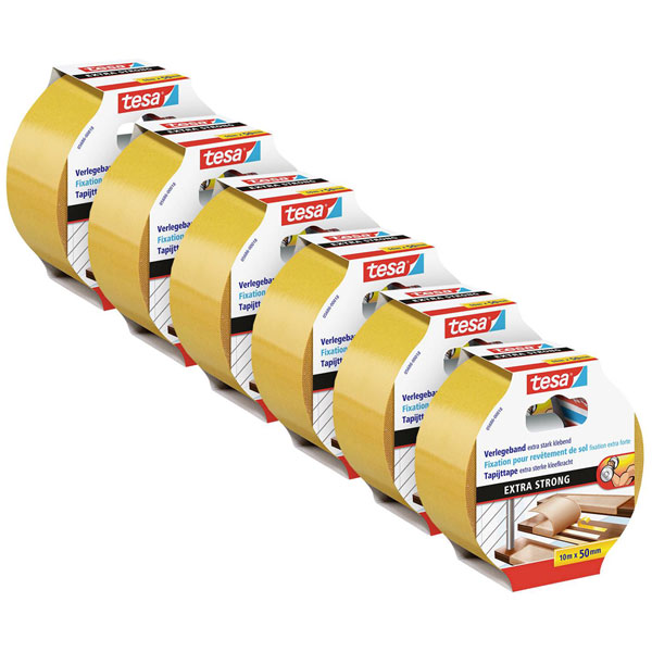 tesa 05686 Double Sided Adhesive Tape is an extra strong, versatile adhesive tool often used for mounting and craft projects. Each pack contains six rolls, with each measuring 10 metres in length and 50 millimetres in width. It is ideal for securing heavy materials or objects both indoors and outdoors.