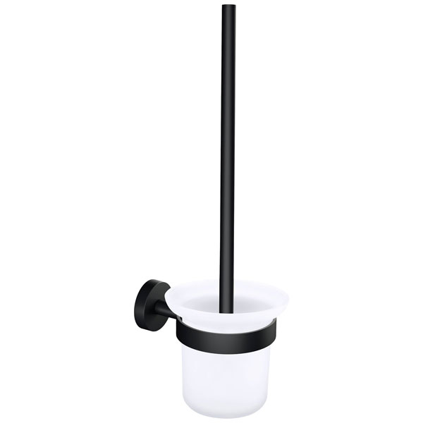 The tesa MOON BLACK Toilet brush and holder, manufactured by tesa, is an elegant bathroom accessory with a sleek black finish. This adhesive metal set is easy to install, providing a sturdy and durable solution for daily cleaning needs. Ideal for modern bathrooms, it enhances both functionality and style.