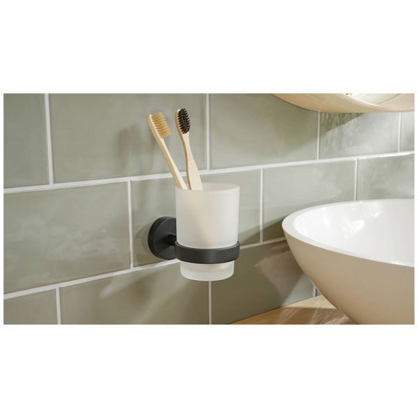 tesa's MOON BLACK Tumbler features a sleek black matte finish with satin glass. It is designed for use as a bathroom accessory, providing a stylish way to store toothbrushes or other essentials. The tumbler can be easily attached to surfaces using its adhesive properties, eliminating the need for drilling.