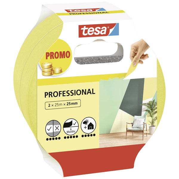 The tesa Professional masking tape 56212-00000-02 is a durable, yellow adhesive tape with dimensions of 50m length and 25mm width. It is designed for precise masking applications, making it ideal for painting and renovation tasks. The package includes two high-quality rolls of tape, suitable for both professional and home use.